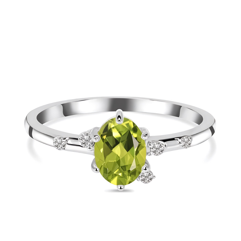 Srebrn prstan z brušenim naravnim peridotom in drobnimi belimi topazi. Peridot, rojstni kamen meseca avgusta je znan kot prinašalec svetlobe, sreče in zadovoljstva. V sebi nosi edinstveno energijo, ki spodbuja pozitivnost, odganja ljubosumje in jezo ter prinaša duhovno pomladitev.