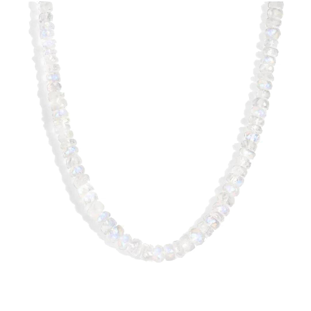 Kette aus natürlich geschliffenem Mondstein, mit 925er Silbergliedern dazwischen.
