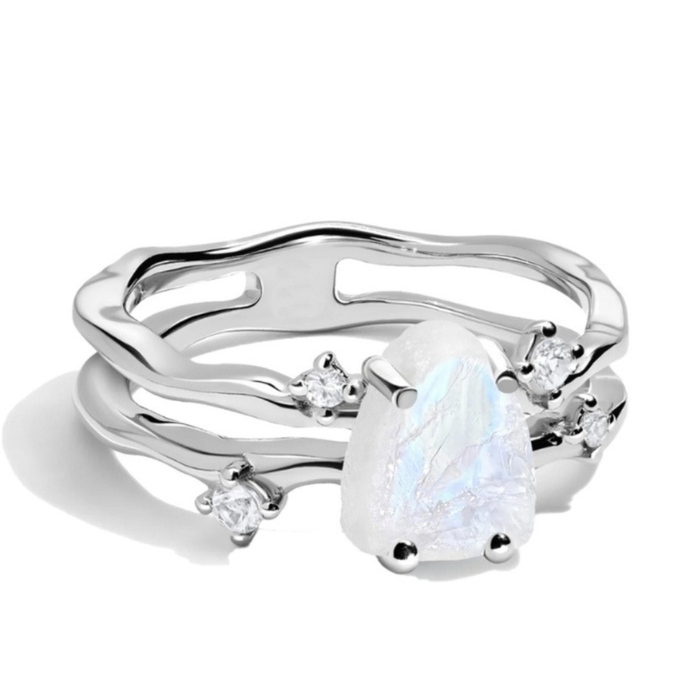 Srebrn prstan z naravnim surovim mesečevim kamnom in belimi topazi. Mesečev kamen, znan po svojem mističnem sijaju, prinaša nežnost, intuicijo in povezanost z luninimi cikli, medtem ko njegova energija pomirja in uravnava čustva.