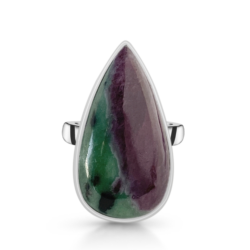 Unikaten srebrn prstan z naravnim kristalom rubin zoisit, ki združuje strastno energijo rubina in harmonične vibracije zelenega zoisita. Spodbuja vitalnost, motivacijo, pogum in duhovno rast, hkrati pa prinaša mir, jasnost in ravnovesje.