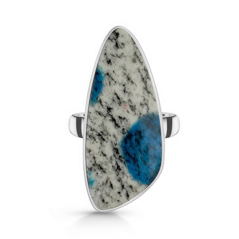 Unikaten srebrn prstan z naravnim kristalom K2, izjemno redkim kristalom, ki nastane z združitvijo granita in modrega azurita ter ga najdemo le ob vznožju gore K2 v Pakistanu. Predstavlja ravnotežje med zemljo in nebom, saj združuje stabilno, zaščitniško energijo granita z duhovno jasnostjo in intuicijo azurita.