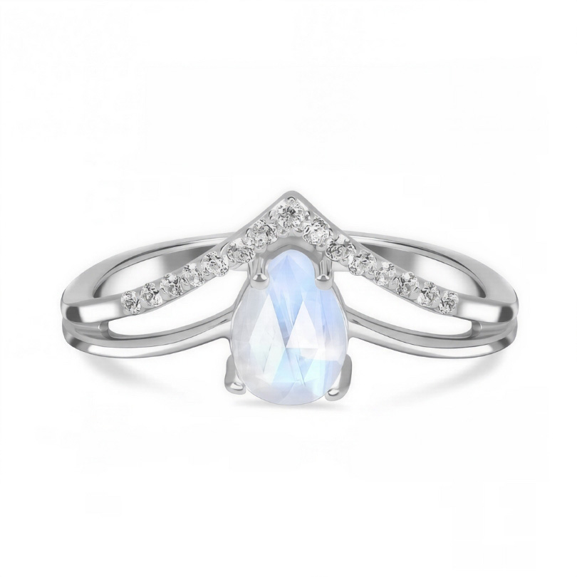 Prstan izdelan iz 925 srebra, z naravnim kristalom mesečev kamen in belimi topazi. Mesečev kamen, znan po svojem mističnem sijaju, simbolizira nežnost, intuicijo in povezanost z luninimi cikli. Njegova energija pomirja in pomaga pri čustvenem ravnotežju, hkrati pa krepi empatijo in razumevanje naravnih ritmov življenja. Na voljo v 3 različicah: srebro 925, srebro 925 s prevleko iz rodija ali srebro 925 s pozlato čistine 750/1000 (18 karatov).