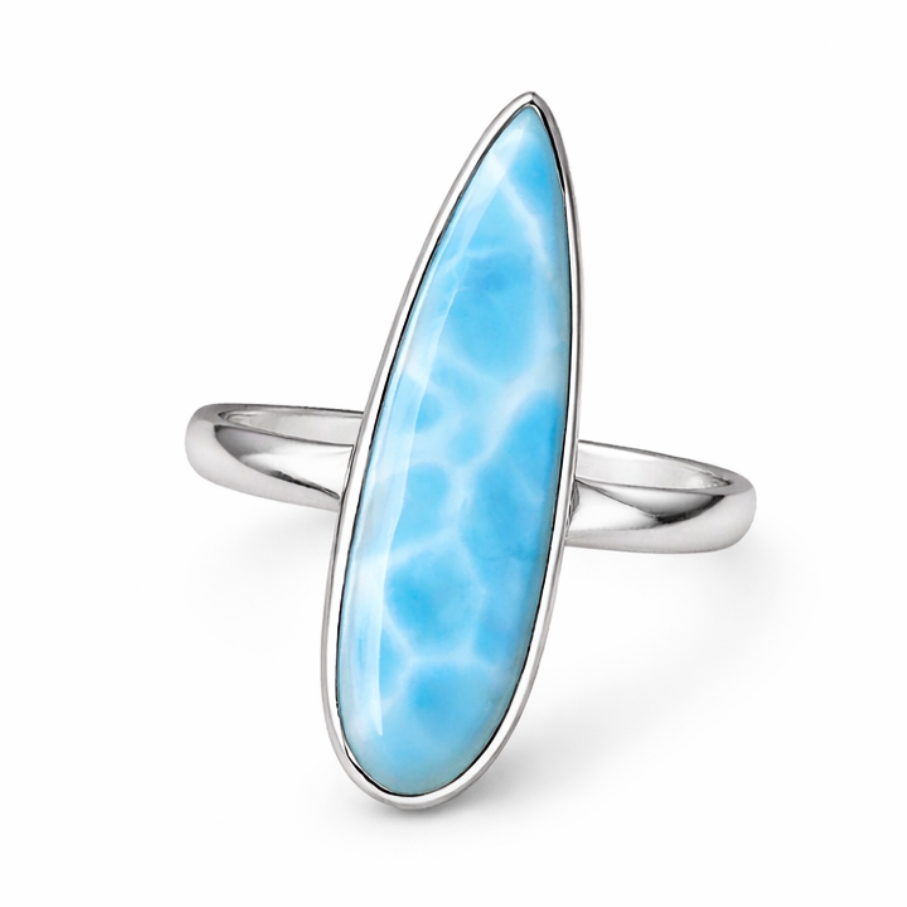 Srebrn prstan z naravnim kristalom larimar. Larimar nas s svojo modrino Karibskega morja in pomirjujočo energijo navdaja z lahkotnostjo in upanjem. Prinaša notranji mir, pogum in veselje do življenja, hkrati pa izboljšuje komunikacijo in blaži stres.