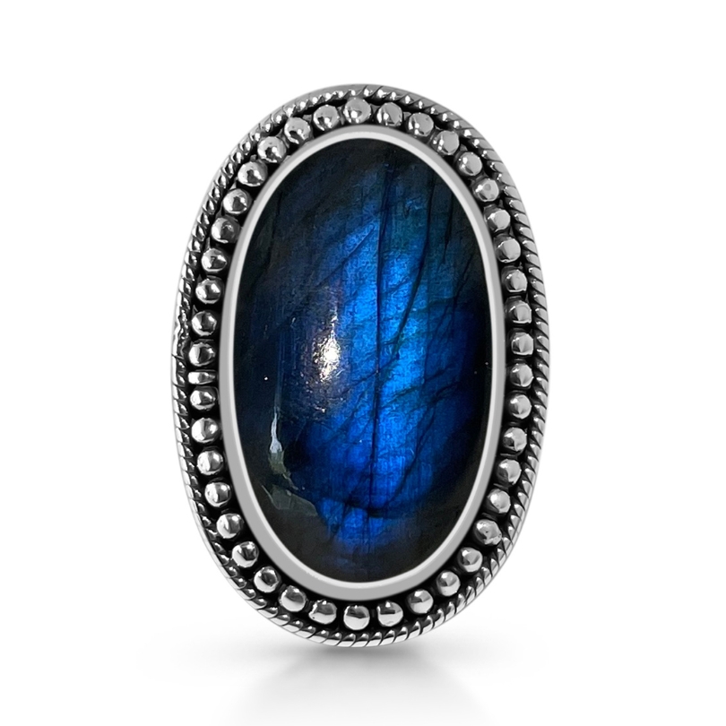 Unikaten srebrn prstan z naravnim poliranim labradoritom, ki je poznan po svoji mistični energiji in preobrazbenih lastnostih. Krepi duhovno in mentalno moč, odpravlja tesnobo, pomaga premagovati omejujoča prepričanja ter spodbuja kreativnost.
