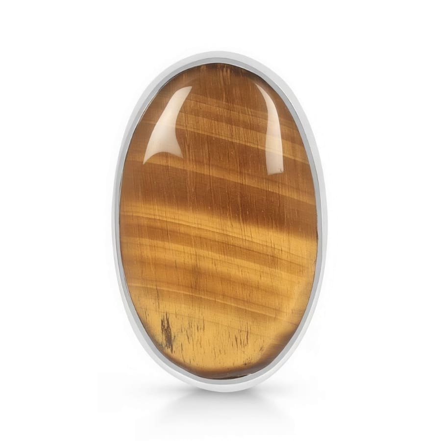 Srebrn prstan z naravnim poliranim kristalom tigrovo oko, poznanim kot kamen poguma, ki povečuje samozavest in jasnost misli. Pomaga pri izražanju notranje moči, zmanjševanju tesnobe in uravnoteženju čustvenega stanja. Deluje kot zaščitni kamen, prinaša ravnovesje, harmonijo in občutke stabilnosti.
