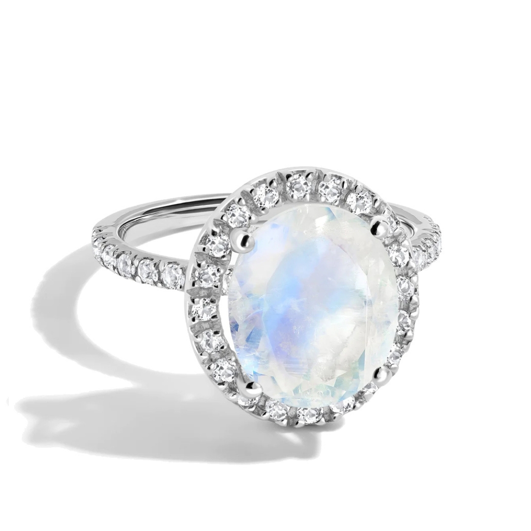 Prsten izrađen od srebra 925, s prirodnim kristalom mjesečevog kamena i bijelim topazima.