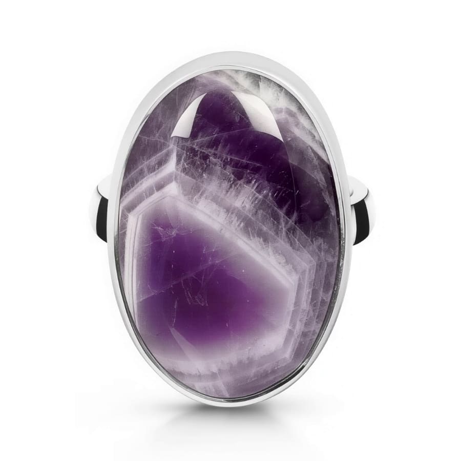 Unikaten srebrn prstan naravnim kristalom ametist z vključki ahata. Ametist, simbol duhovnosti, mistike in zaščite, vas bo spremljal s svojo edinstveno energijo in čudovito vijolično barvo, ki prinaša notranji mir, zaščito in moč.