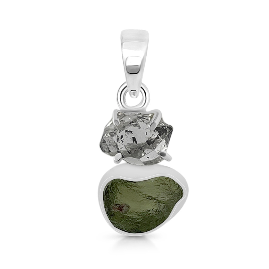 Unikaten srebrn obesek s surovim naravnim moldavitom in herkimer diamantom. Moldavit je redek tektit v katerem se prepletata energija vesolja in Zemlje in simbolizira transformacijo, zaščito in duhovni razvoj. Herkimer diamant je univerzalni zdravitelj in izjemen prevodnik življenjske energije, ki dviguje duhovno zavedanje.