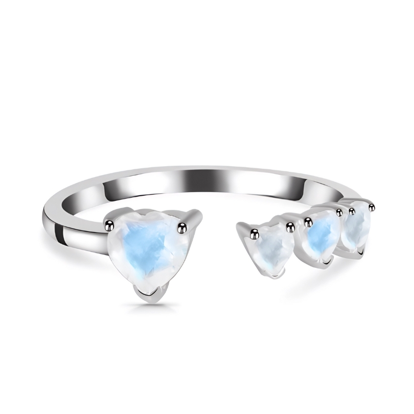 Prstan izdelan iz 925 srebra, z naravnimi kristali mesečev kamen. Mesečev kamen, znan po svojem mističnem sijaju, simbolizira nežnost, intuicijo in povezanost z luninimi cikli. Njegova energija pomirja in pomaga pri čustvenem ravnotežju, hkrati pa krepi empatijo in razumevanje naravnih ritmov življenja. Na voljo v 3 različicah: srebro 925, srebro 925 s prevleko iz rodija in srebro 925 s pozlato čistine 750/1000 (18 karatov).