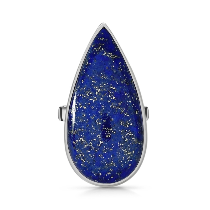 Unikaten srebrn prstan z naravnim poliranim kristalom lapis lazuli, ki s svojo globoko modrino z drobnimi zlatimi pikami spominja na noč posuto z zvezdami. Lapis lazuli spodbuja samozavedanje, izražanje in resnico, ter je povezan z univerzalno modrostjo in duhovnostjo.